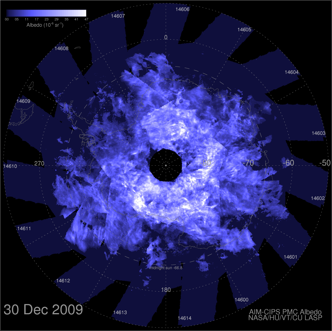 Choreographed from patterns and movement of noctilucent clouds from the AIM CIPS instrument, a panoramic imager.